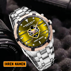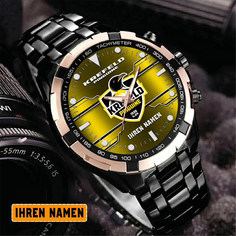 Die Krefeld Pinguine Edelstahl-Uhr vereint mühelos sportliche Eleganz mit Teamstolz. Mit ihrem robusten Edelstahl-Design und dem ikonischen Logo ist sie ein stilvolles und leidenschaftliches Accessoire für jeden Fan.