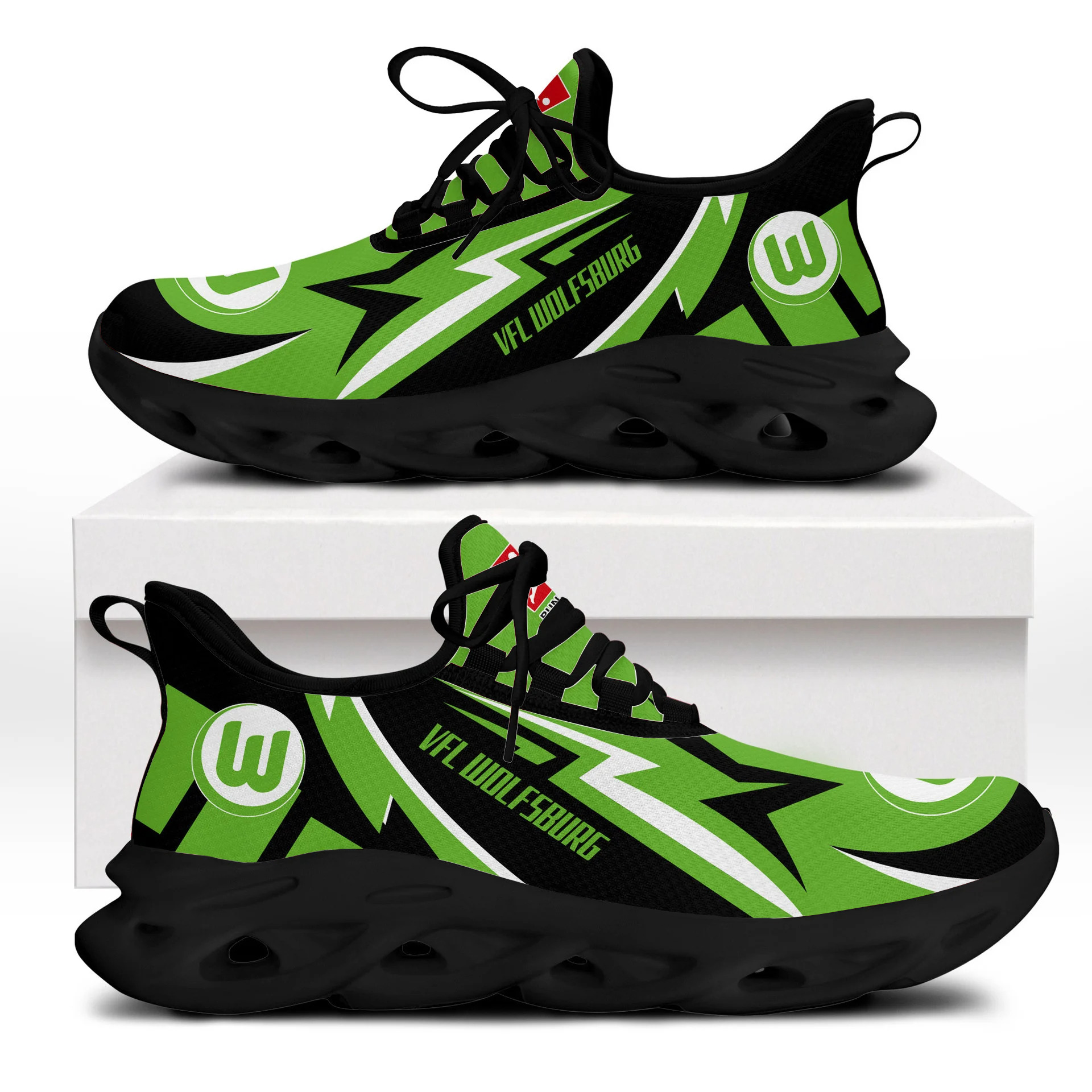 Diese Schuhe verfügen über klare VfL Wolfsburg-Grafiken und sind sowohl für Männer als auch für Frauen konzipiert.